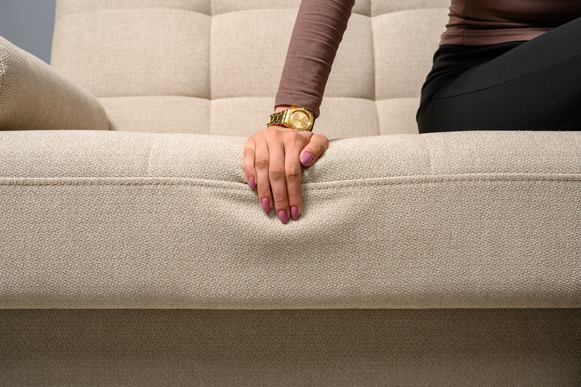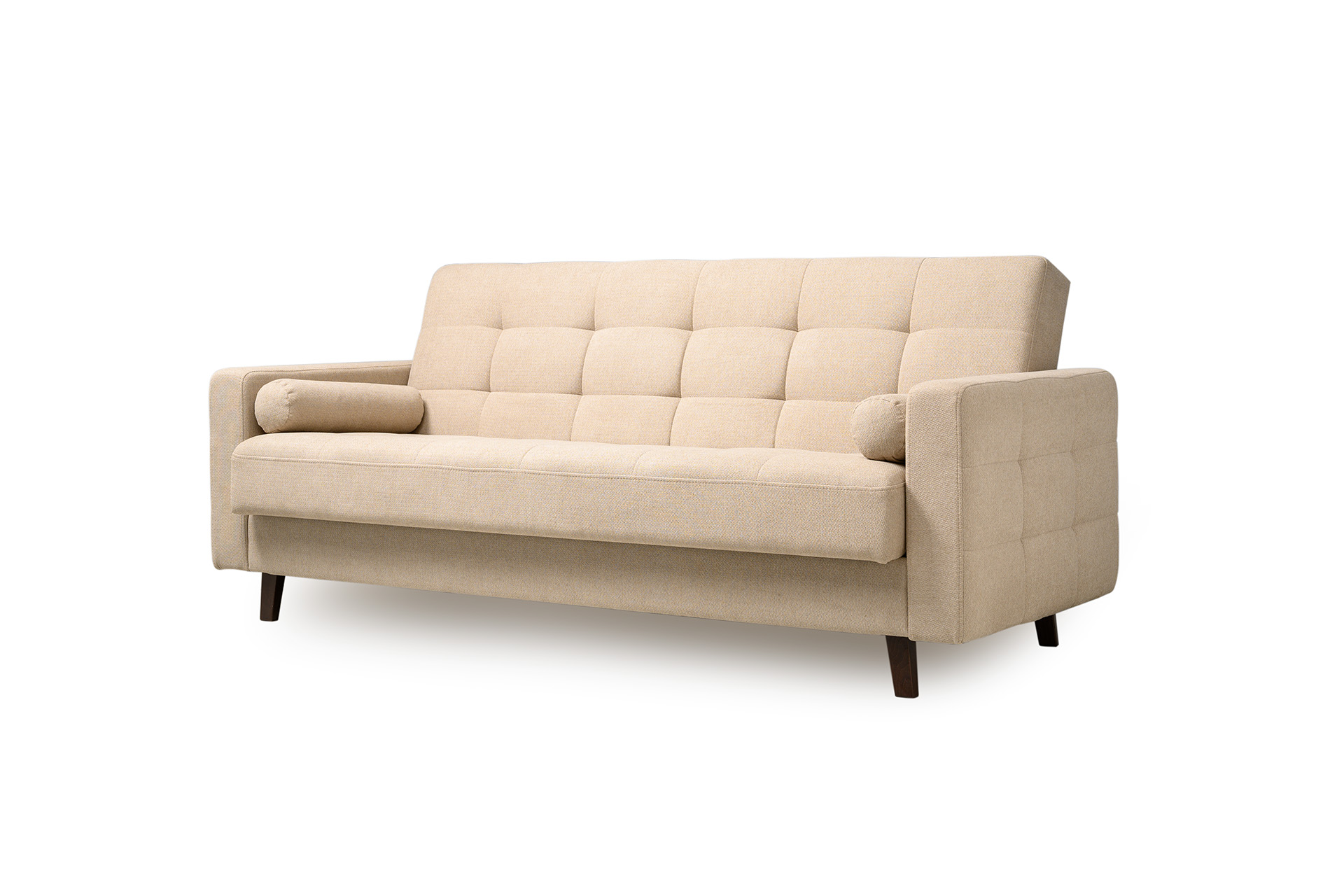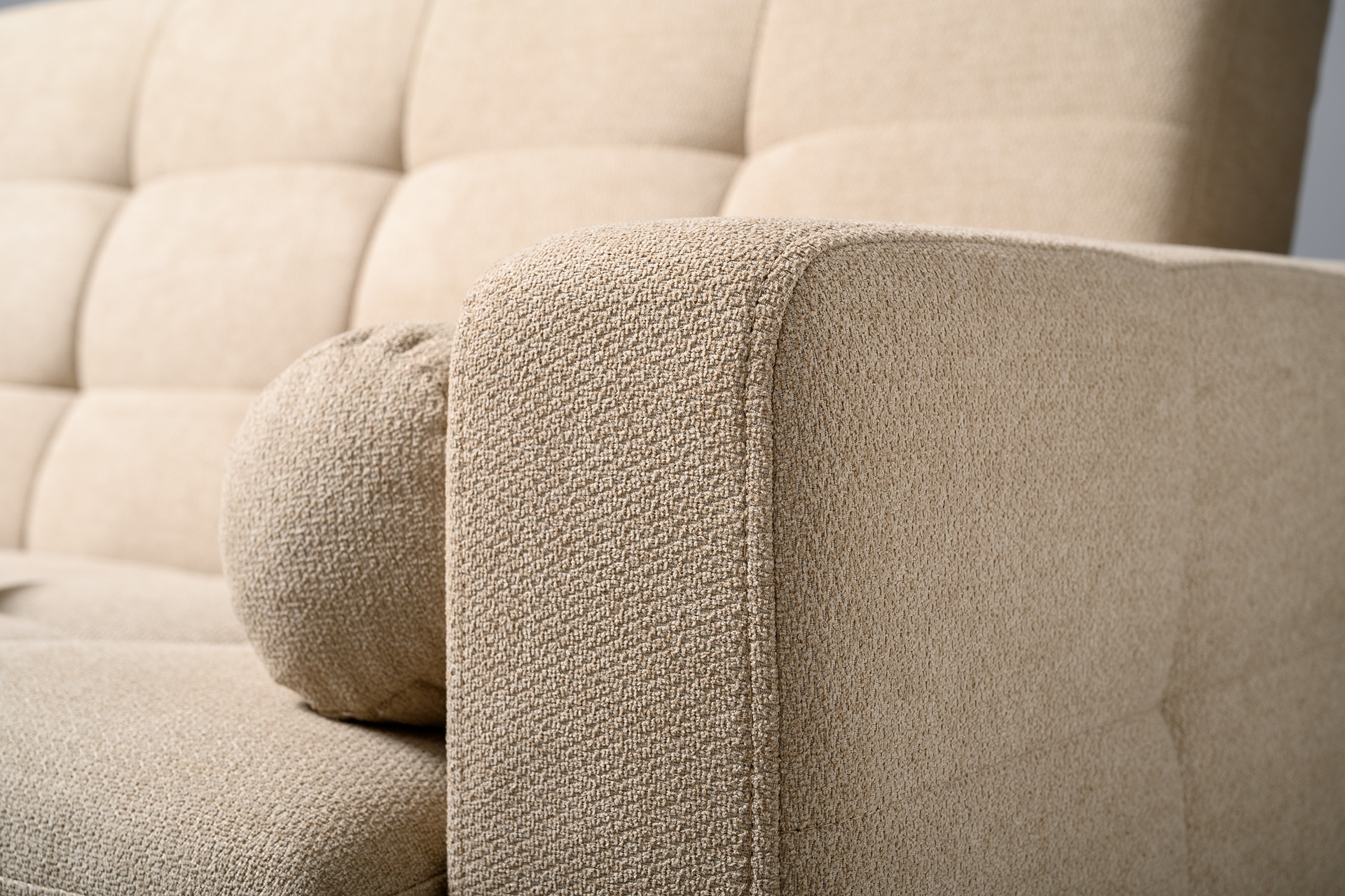 Прямоугольная стежка по спинке, посадочному месту и подлокотниках, круглые подушки-валики