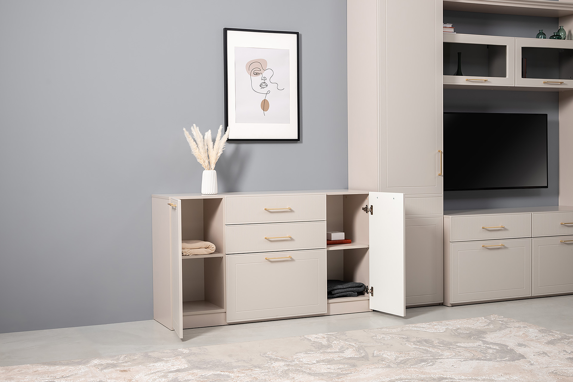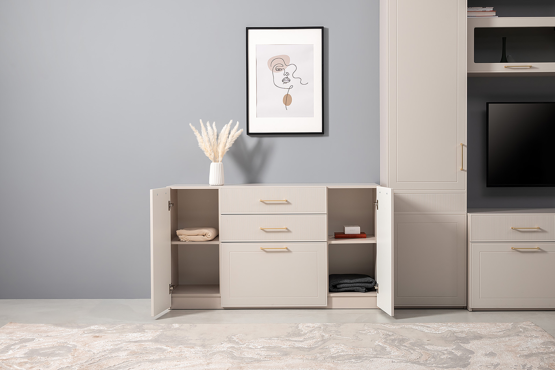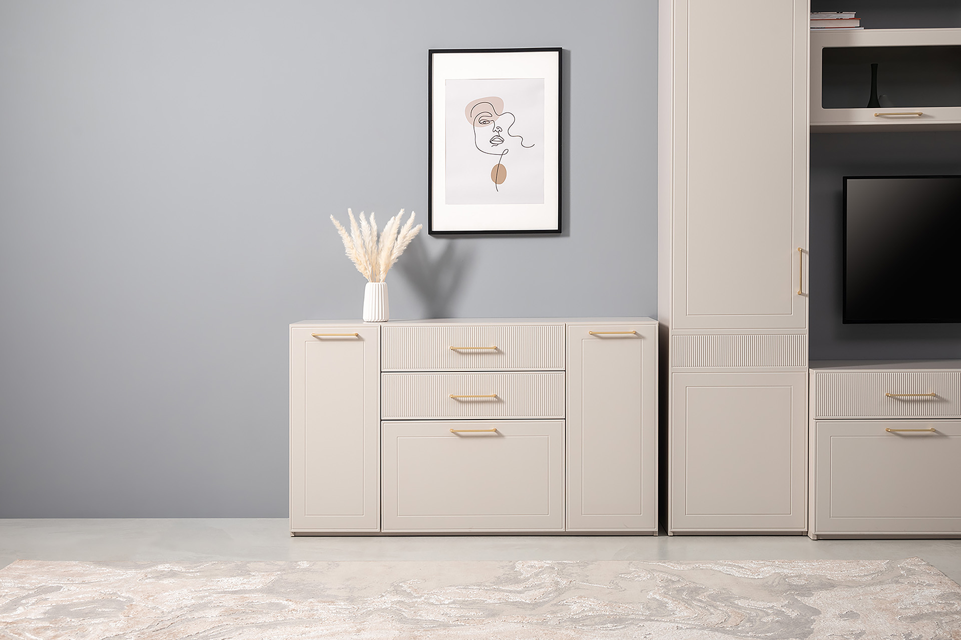 Гостиная Ричфорд композиция 2 с карнизами, кашемир 5981 BS, моно керамика D166-2 ПВХ, белый PE шагрень (собирается на любую сторону)