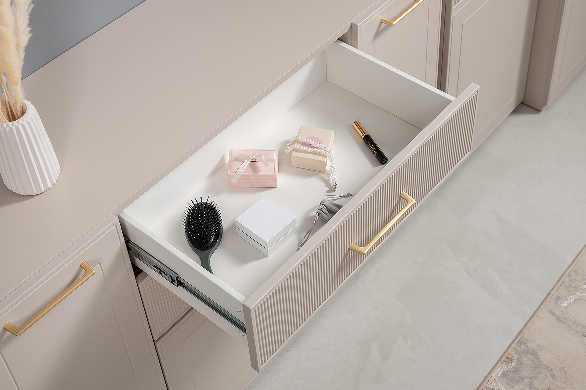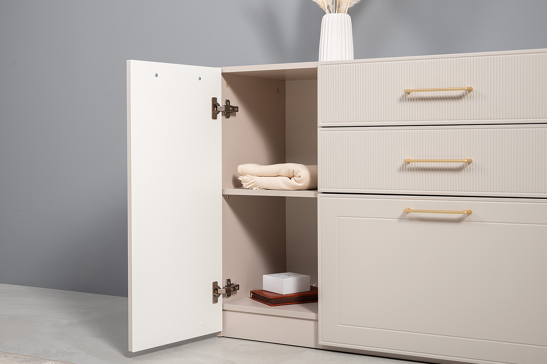 Тумба под ТВ Ричфорд 16.61 кашемир 5981 BS, моно керамика D166-2 ПВХ, белый PE шагрень