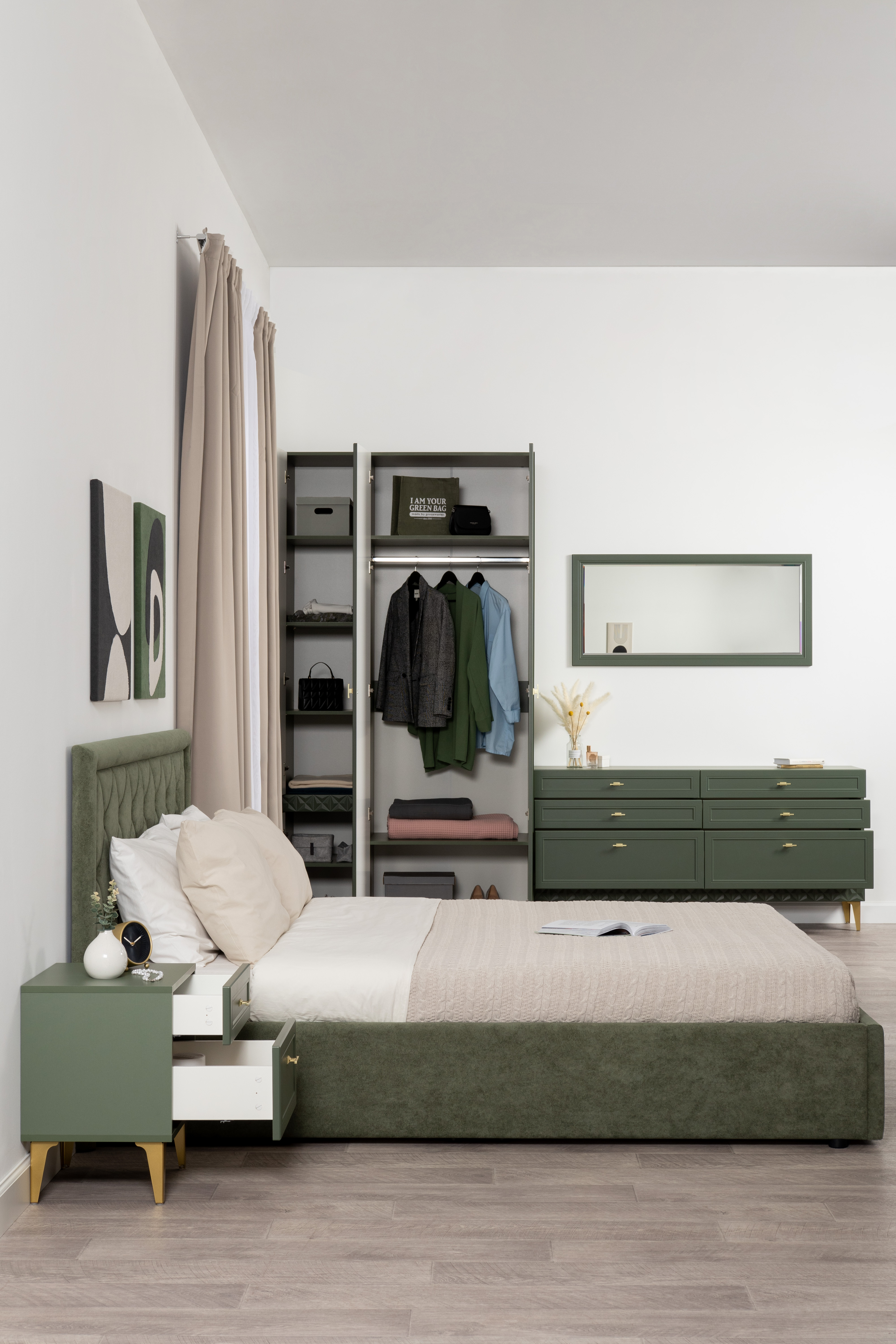 Изящные линии, глубокая фрезеровка фасадов из МДФ и благородные оттенки. Утончённая «Слоновая кость» и изысканная «Олива Шагрень» с глубоким зелёным тоном — создают атмосферу уюта, тепла и благородства. Металлические ручки и опоры золотого цвета придают мебели утончённый блеск, а петли и направляющие с доводчиками обеспечивают плавное и бесшумное закрытие фасадов.