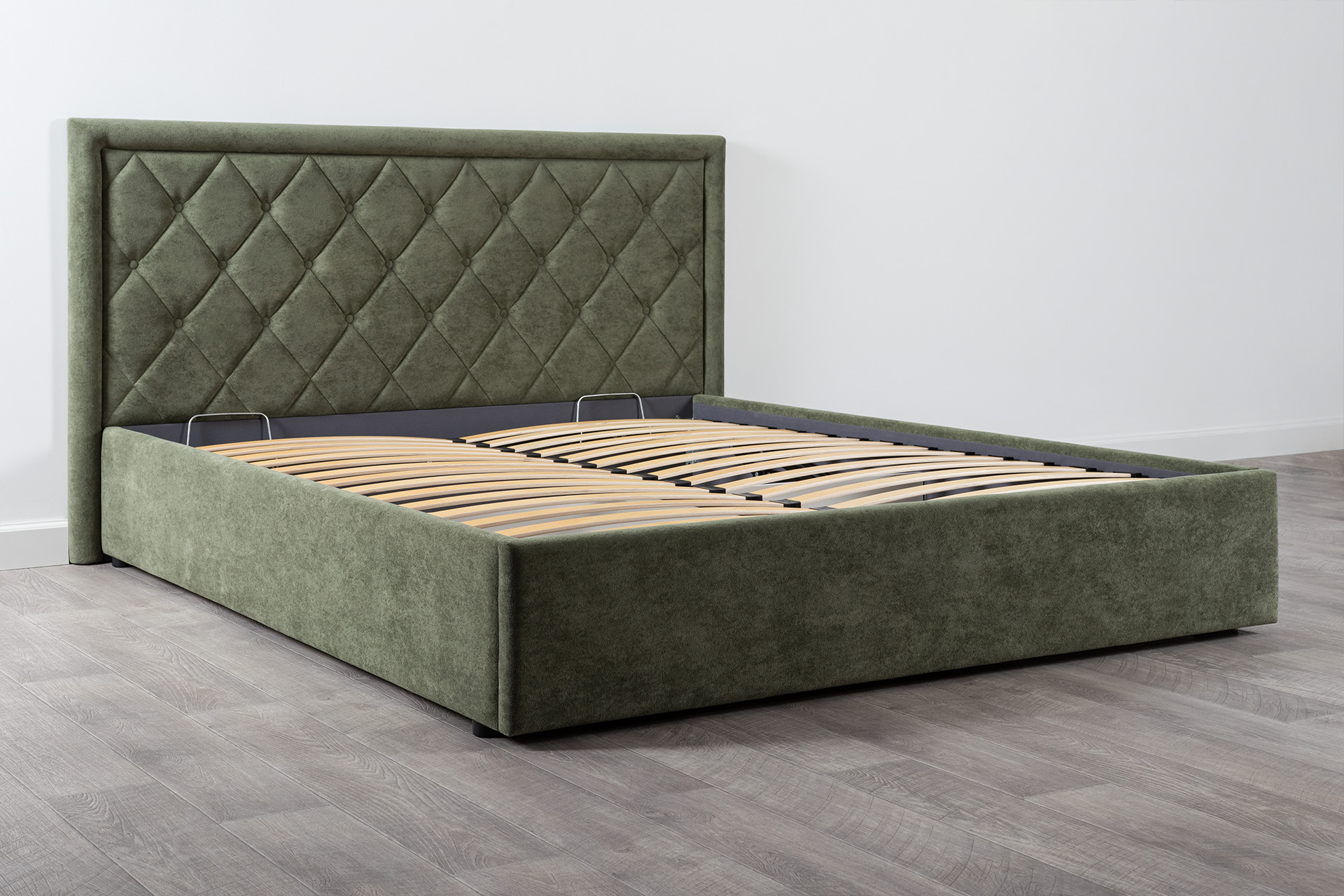 Основание кровати укомплектовано матрасодержателями. Жесткое кроватное дно из ЛДСП 16 мм на опорах 25 мм.
