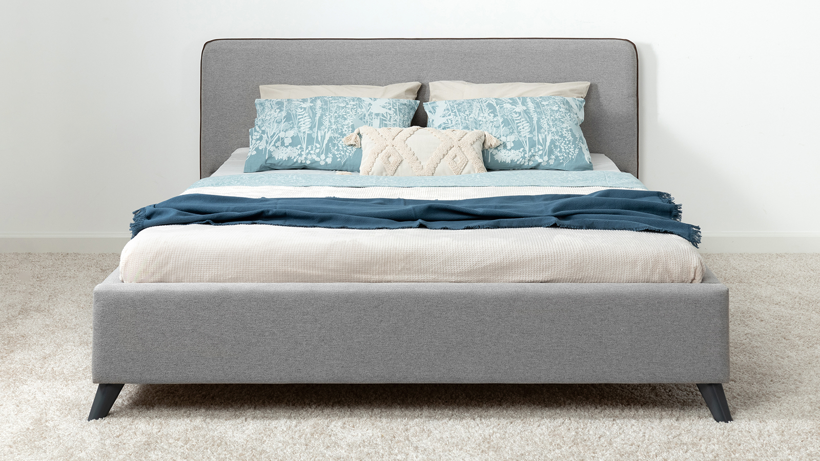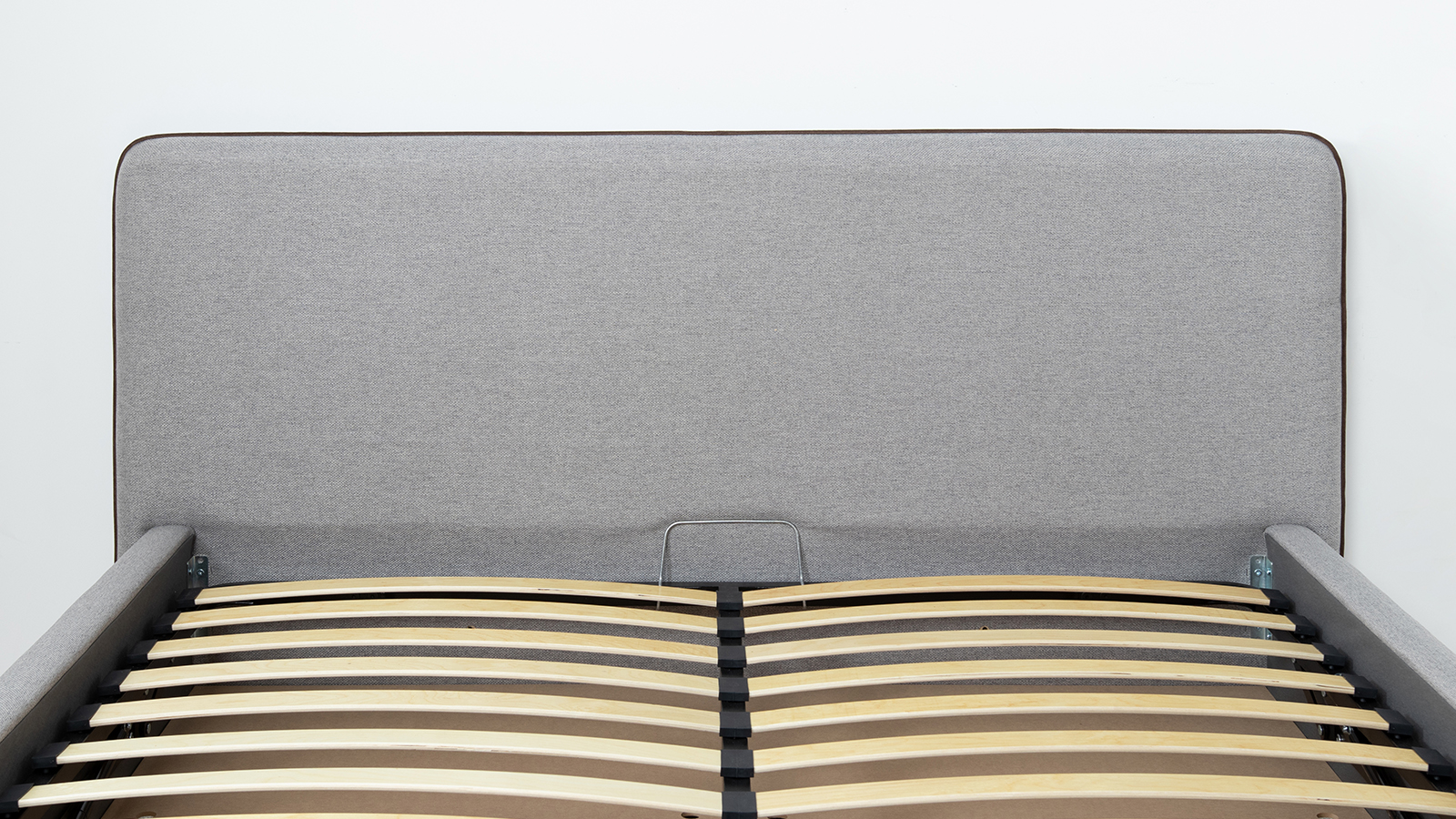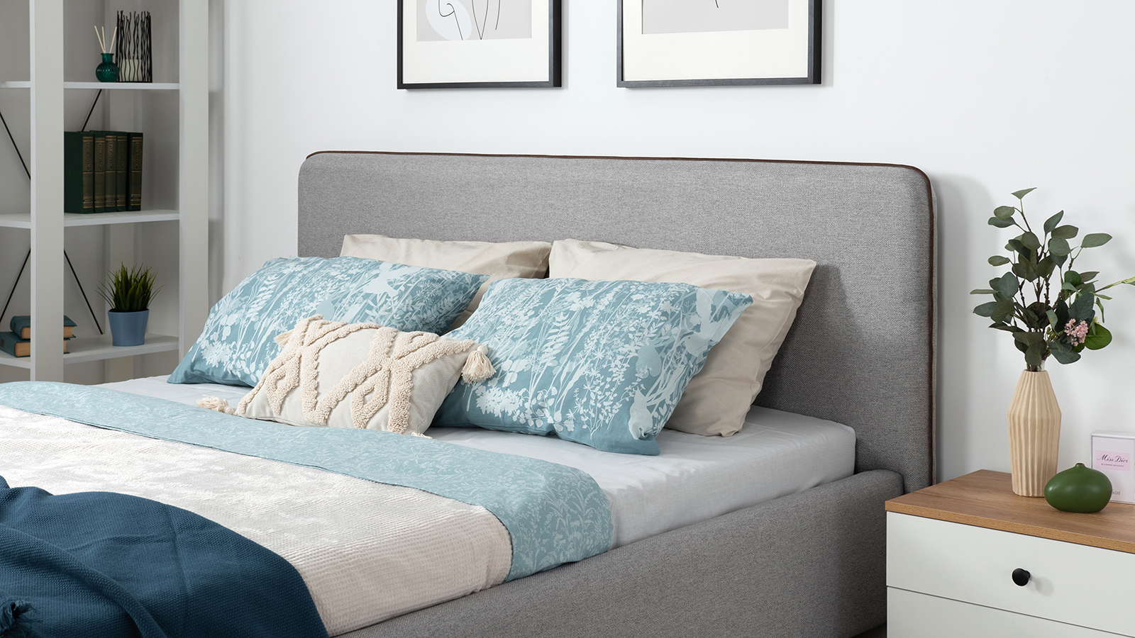 Кровать Миа 140 рогожка серый, кант желтовато-коричневый с ортопедическим основанием и подъемным механизмом